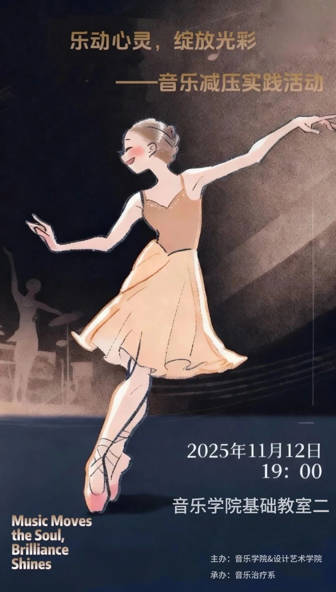 为缓解当代大学生学业与生活压力,搭建心灵沟通的桥梁,在十一月心理健康月的温馨氛围中,由音乐学院联合设计艺术学院心育部一起举办的“乐动心灵,绽放光彩”音乐减压实践活动圆满完成。参与活动的同学们跟随着音乐律动,以游戏的方式共同经历了一场缤纷的心灵之旅,让律动与心灵共鸣,为青春注入活力与光彩。