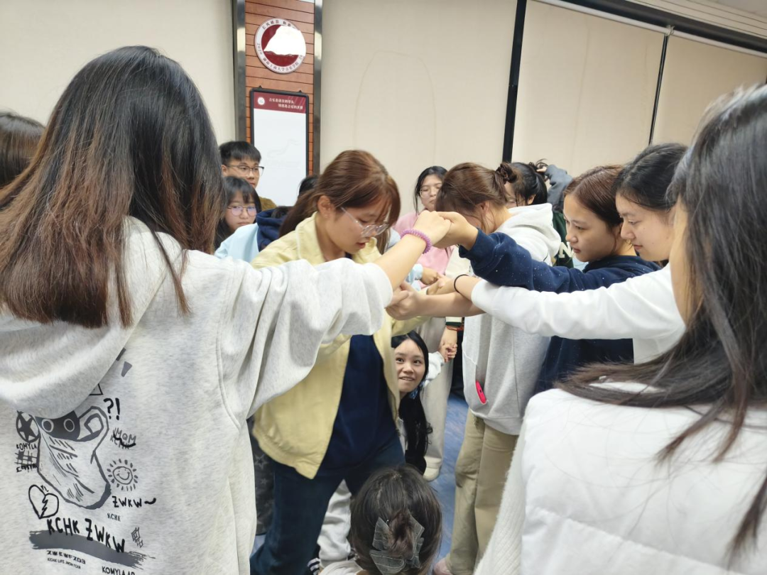 音乐停止时,大家纷纷寻找最初左右两边的同学。当手与手再次紧紧相握,起初闭眼时的小心翼翼,瞬间化作共同解绳结的坚定动力。众人同心携手、默契配合,让原本凌乱交错的线条,一步步回归成完整的圆圈,在欢声笑语中共享协作成功的喜悦。