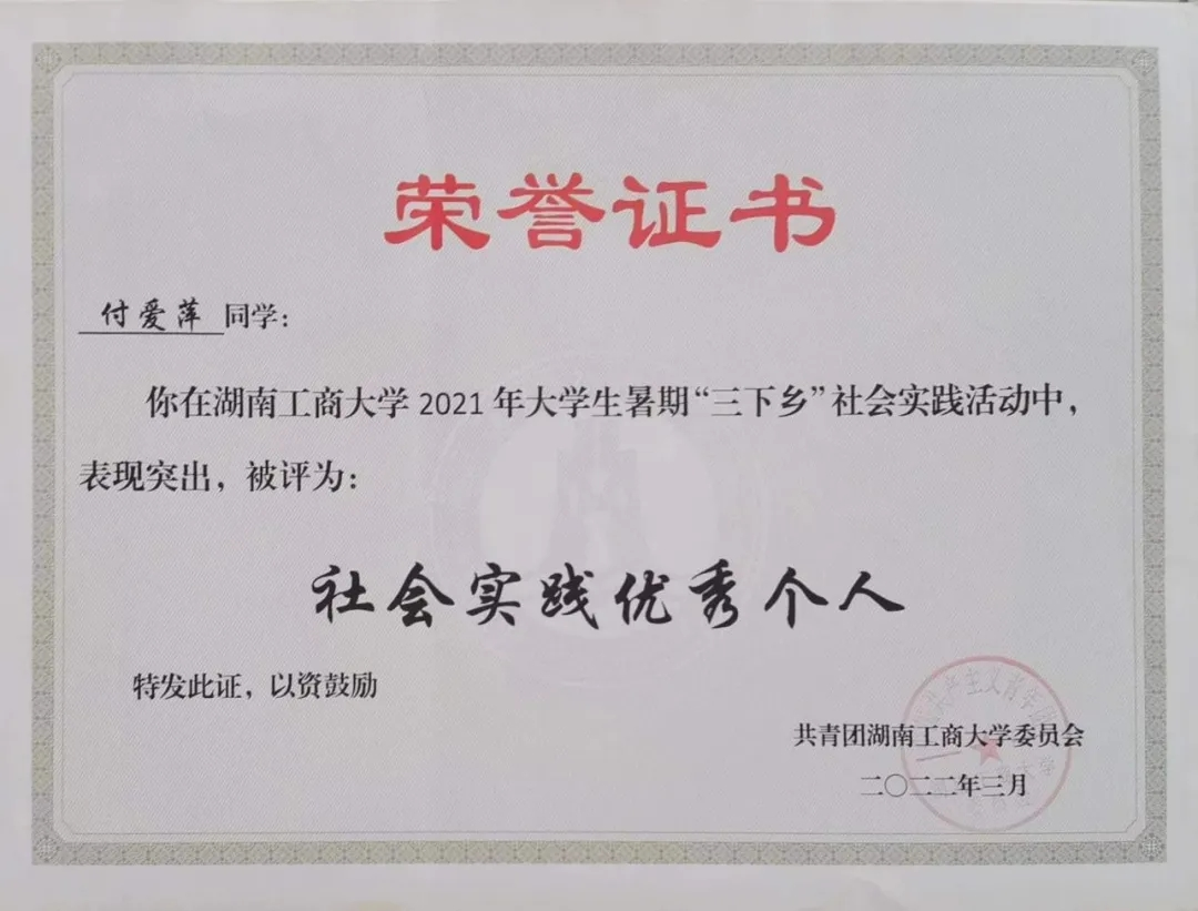 荣获2022年“国家奖学金”、获2023届省级“优秀毕业生”、校级“最美大学生”、校级“十佳青年”、“三好学生”、“优秀学生干部”、“优秀团员”、校级“三下乡”社会实践活动、校级“优秀个人”、“优秀青年志愿者”、“湖工商大学生讲党史”实践活动“二等奖”。